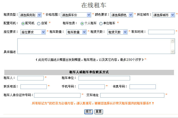 3、選擇或認(rèn)真填寫帶"*"的欄目,尤其是租車人或租車單位的詳細(xì)信息。認(rèn)真填寫上述必填信息將有助于我們及時和您取得聯(lián)系。